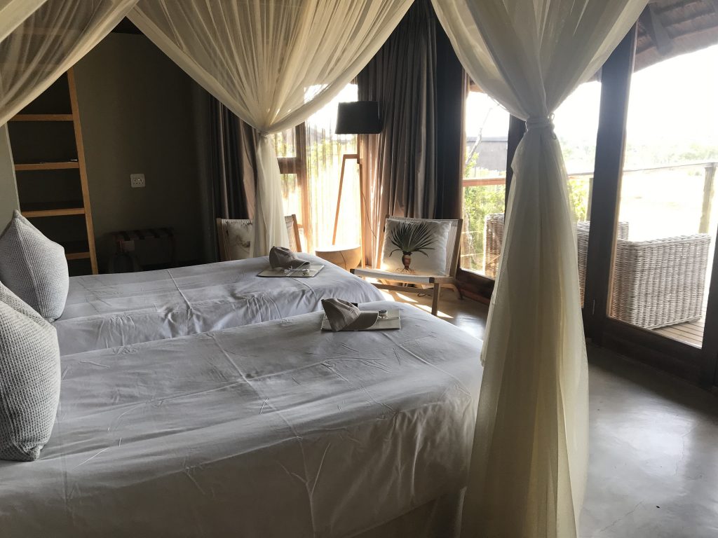 Am nächsten Morgen steht eine Pirschfahrt auf dem Programm, bei der unsere Rangerin Anouschka uns zu Elefanten, Antilopen, Gnus und Zebras führt. Die tierischen Herrschaften wirken noch ein wenig müde … Ebenso wie wir, es ist ja noch früh am Morgen. Im Anschluss gibt es ein leckeres Frühstück, bevor wir per Transfer zur nächsten Unterkunft im Reservat gefahren werden. Die luxuriöse Mhondoro Lodge begeistert uns mit umfassendem Komfort, sehr gutem Service und hervorragender Küche. Wir fühlen uns gleich wie die Könige und erkunden bei einem Rundgang sämtliche Einrichtungen der Lodge. Ein besonderes Highlight ist ein Unterschlupf, der durch einen unterirdischen Tunnel mit der Lodge verbunden ist und an dessen Ende man die Tiere, die am Wasserloch trinken, in aller Ruhe beobachten kann.