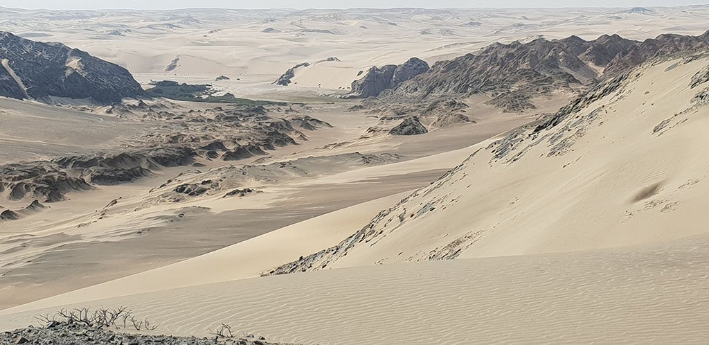 Am nächsten Tag steht ein Ganztagesausflug in den Hoarusib Canyon an. Das gerade fast trockene Flussbett erhält sein Wasser aus den Bergen weiter im Nordwesten und Nordosten. Von der Lodge aus fahren wir über den Dünenkamm direkt hinunter zum Flusstal. Ein traumhafter Anblick! Wie eine kleine Oasenlandschaft erscheint inmitten der sonstigen Dürre sattes Grün!
