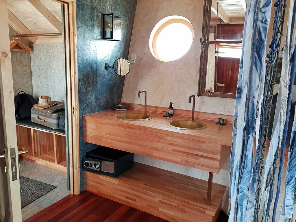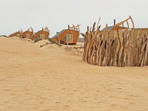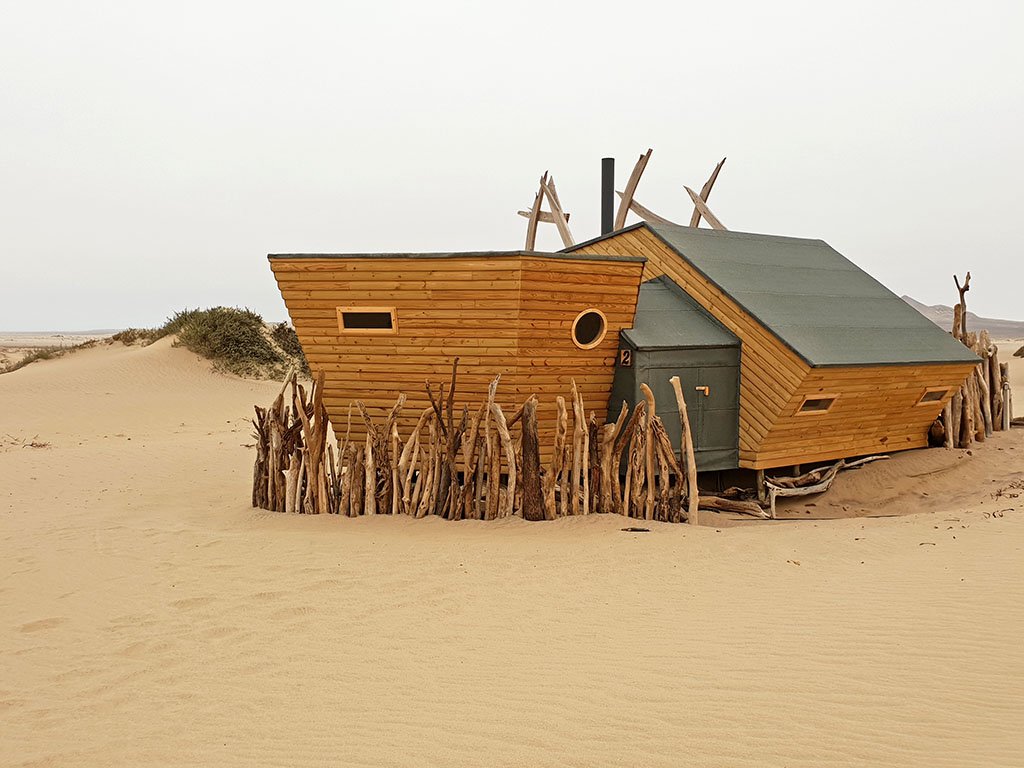 Die 10 separaten Häuschen, 2 davon für Familien eingerichtet, sind im Stil von Schiffswracks gestaltet. Natürlich gibt es ein schönes Bad und eine herrliche Dusche. Von der privaten Veranda blickt man in die grenzenlose Weite. Zur Ausstattung gehören ein Safe, eine Tee/Kaffee-Station und ein wunderbarer kleiner Kaminofen, der Wäscheservice ist im Preis inbegriffen. Diverse Anschlüsse zum Aufladen elektronischer Geräte sind ebenfalls vorhanden. Ausflüge in das Hoarusib-Tal und auch nach Möwe Bay sind bei einer Buchung ab 3 Übernachtungen inkludiert. Dabei sieht man die Überreste von zwei Schiffwracks (Suiderkus, Karimona), eine Robbenkolonie, eine stillgelegte Diamantenmine und die Überreste eines Ventura-Bombers, der hier gelandet war und aufgrund des Sandbodens nicht mehr starten konnte.