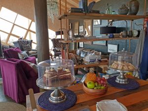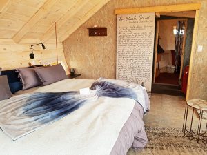 Bei der Ankunft „in the middle of nowhere“ am späten Nachmittag werden die Gäste mit Kaffee und Kuchen empfangen. Über in Streifen geschnittene Autoreifen wird man dann zu seinem Häuschen geführt.
