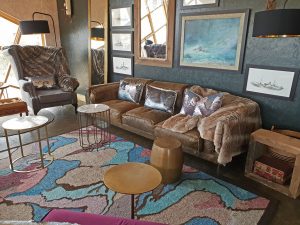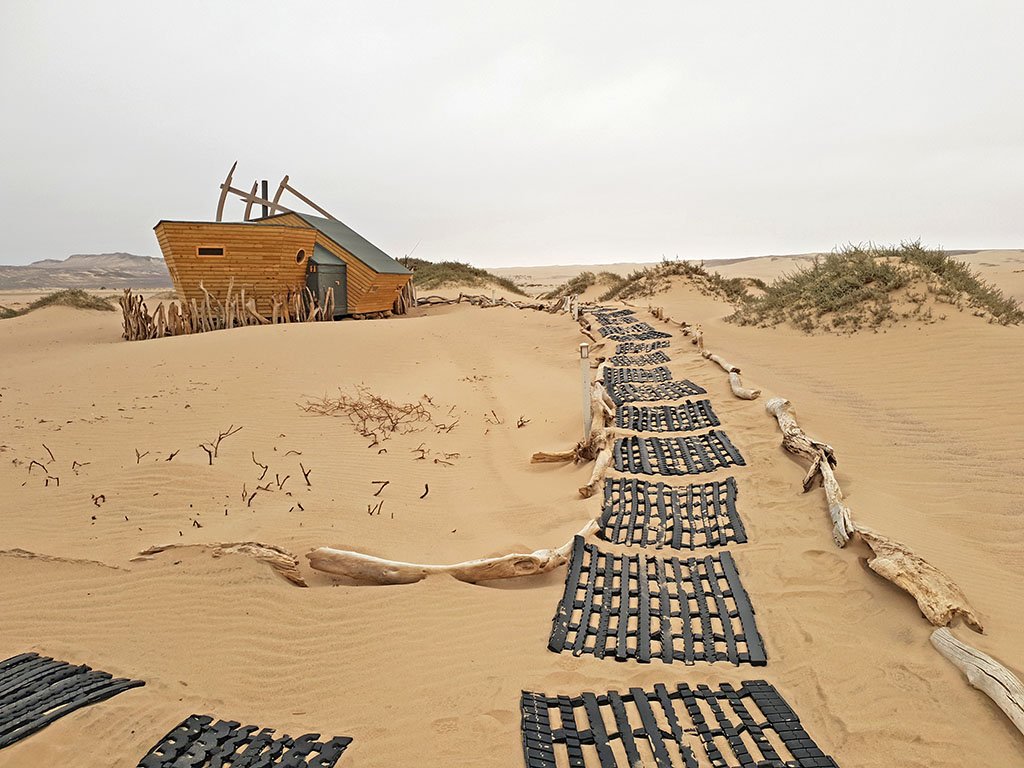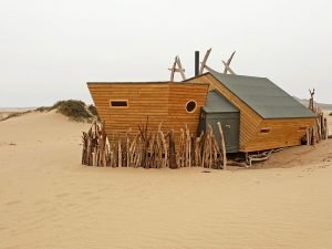Als Gast der Shipwreck Lodge lässt man in Möwe Bay den eigenen Mietwagen stehen und steigt zur vereinbarten Zeit in einen Geländewagen der Lodge um. Nun geht es auf wilden, abenteuerlichen Spuren zur Lodge. Nach knapp 2 Stunden erscheinen wie eine Fata Morgana die wrackähnlich gestalteten Einzelhäuschen am Dünenkamm. Im kleinen, maritimen Restaurant und im gemütlichen Aufenthaltsraum überrascht das hübsche, originelle Design. Holz, bunte Stoffe, schlichte Tische, bequeme Sessel, viele Kissen: Hier fühlt man sich sofort zu Hause, und wenn draußen Nebelschwaden vorbeiziehen, ist es besonders gemütlich.