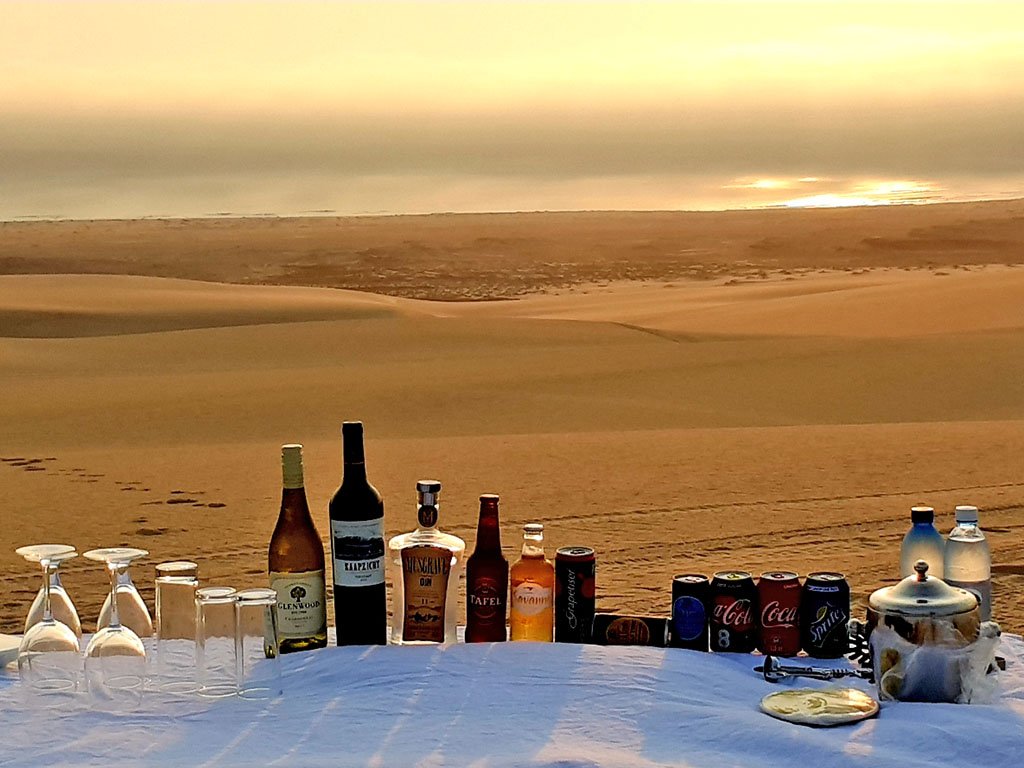 Zurück in der Shipwreck Lodge ist es Zeit, den Sundowner zu planen, entweder auf der Terrasse oder auf einer Düne, die man mit dem Geländewagen in wenigen Minuten erreicht.