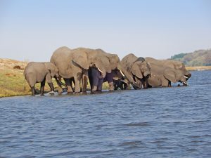 Heute fahren wir zunächst ein Stück durch Botswana, da unsere nächste Unterkunft, die Ichingo River Lodge, auf der Privatinsel Impalila Island auf namibischer Seite des Chobe Flusses liegt, wo man nur von Kasane aus hinkommt. Das Aus-/Einreiseprozedere bedarf ein wenig Geduld, aber wir sind ja schließlich in Afrika, wo es Hakuna Matata heißt. Per Boot transferiert uns unser Guide Felix zur Insel. Unterwegs sehen wir viele Vögel als auch ein Krokodil. Am späten Nachmittag unternehmen wir eine Sundowner-Bootsfahrt, auf der wir viele Tiere sehen. Ob am Ufer des Chobe Nationalparks, auf den Inseln im Chobe Fluß als auch im Wasser, Elefanten so weit das Auge reicht! Besonders schön anzuschauen ist die Durchquerung einer Elefantenfamilie durch das Wasser. Auch hier stockt mir wieder der Atem. Diese unglaublich tollen Bilder muss ich unbedingt festhalten! Aber auch Büffel, Giraffen, Warzenschweine, Paviane und Flusspferde erblicken wir.