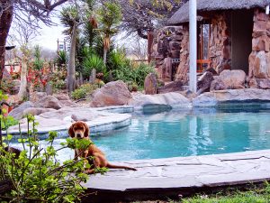 Nachdem wir wieder sicher im Kleinflugzeug gelandet sind, machen wir noch einmal Zwischenstation in Maun, im zentral gelegenen Cresta Maun Hotel. Am nächsten Tag liegt eine lange Fahrt vor uns. Ein wenig erschöpft kommen wir nach 6,5/7 Stunden Fahrt in unserer letzen Station in Kalahari Bush Breaks(Titelbild des Beitrags), nähe Gobabis an. Sehr idyllisch wirkt das Farmgelände mit seinen bunten Bäumen und dem wunderschön angelegten Garten. Überschwänglich werden wir von einer Hundefamilie empfangen. Zu niedlich die kleinen Welpen! Gemütlich lassen wir den Tag ausklingen.
