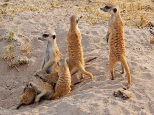 Unterwegs machen wir Halt, um einer habituierten Erdmännchenfamilie einen Besuch abzustatten. Wie putzig die kleinen Tierchen doch sind! Und so zahm! Nachdem ich mich auf einer Decke niedergesetzt habe, kommt auch schon das erste Tierchen an und klettert flink auf meinen Schoss. Nun will es hoch hinaus und setzt an, aber weil es mich kitzelt und ich nicht stillhalten kann, überlegt es sich dann anders und flitzt weg. Ach schade … ein Erdmännchen auf meinen Kopf wäre zu lustig gewesen.