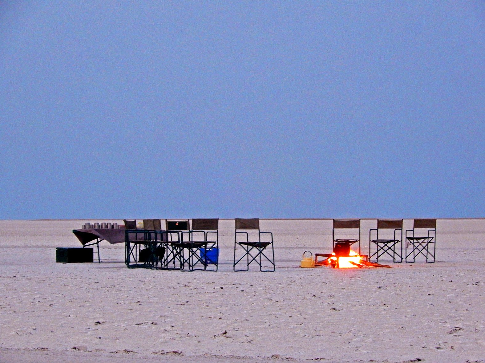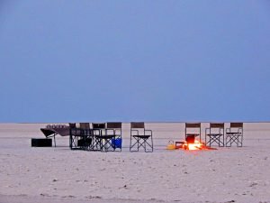 Im Anschluss geht es per Quadbike in die Salzpfanne. Mensch ist das abenteuerlich! Allmählich wird es dunkel und wir schalten das Licht am Fahrzeug ein. In der Kolonne mit Guide fühlen wir uns sicher und kommen auch schon bald am Ziel an. Nun eröffnet sich mir ein Bild, das ich mir nicht hätte erträumen können. Wir werden bereits von einem Mitarbeiter des Camps am Lagerfeuer erwartet. Unsere Schlafsäcke mit integrierter Matratze liegen auch schon im Nirgendwo. Unglaublich, denke ich! Weit und breit keine Menschenseele! Welch eine Romantik sich uns hier ergibt. Ich hätte nicht gedacht, dass das Barbecue so lecker ist. Nach einem köstlichen Glas afrikanischen Wein, begeben wir uns nach und nach zu unseren Schlafsäcken.