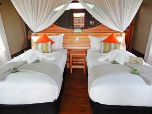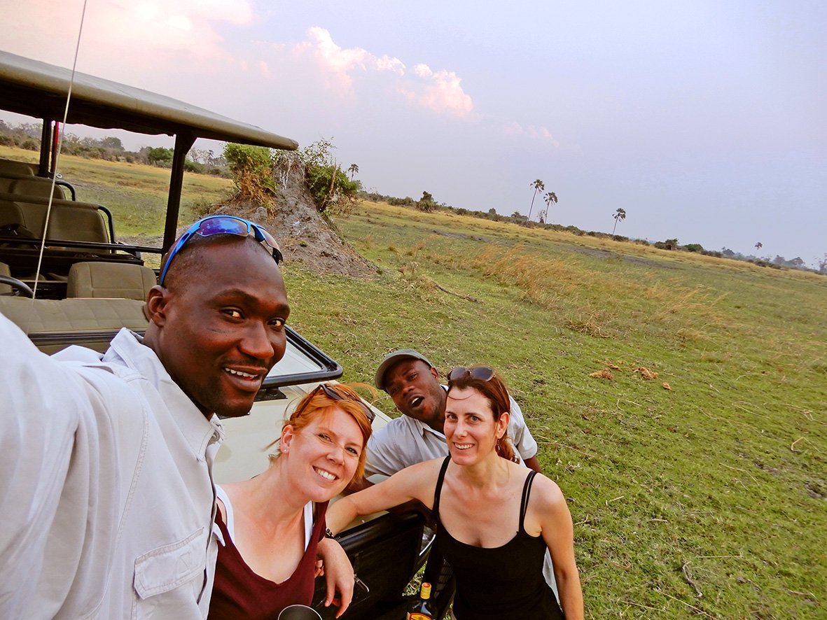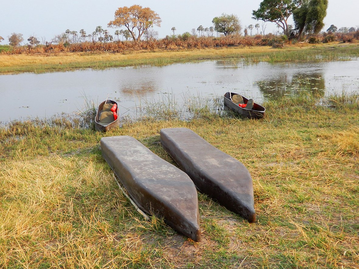 Nach dem Frühstück fahren wir weiter nach Maun, wo wir eine Zwischenübernachtung im Mochaba Crossing Camp einlegen. Am Folgetag geht es dann mit einer Cessna ins Delta. Allein der Flug ist schon ein Erlebnis! Nach Ankunft am Airstrip werden wir bereits von unserem Guide Max und seinem Kollegen Marc mit einem kühlen Getränk erwartet. So viele Wow-Momente, denke ich. Voller Freude fahren wir los und werden gleich nach unseren Tier-Interessen gefragt. Elefanten und Löwen wollen wir noch einmal sehen! Super, sagt Max, dann schauen wir einmal, was sich da machen läßt, und grinst. Nach ca. 20 Min. kommen wir im wunderschönen Rra Dinare Camp, was übersetzt Vater Büffel heißt, an und werden vom Personal und den Camp-Managern mit einem afrikanischen Tanz und Gesang willkommen geheißen. Das nenne ich mal eine Begrüßung! Richtig klasse! Das Camp befindet sich in einem privaten Konzessionsgebiet am Gomoti-Fluß, neben dem Moremi Game Reserve. Die nächsten beiden Tage stehen ganz im Zeichen der Tierbeobachtungen. Bereits auf unserer ersten Pirschfahrt sehen wir Elefanten, Impalas, Zebras, Büffel, Löwen und sogar einen Strauß. Auf einer Mokorofahrt (traditionelles Einbaumkanu) erkunden wir den Gomoti-Fluß und sichten weitere Tiere. Spannend solch eine Bootsfahrt! Im Anschluß stärken wir uns bei einem Picknick. Auch unser Canvas-Zelt ist grandios! Mit sehr viel Liebe zum Detail eingerichtet und einem traumhaften Blick in den Busch. Das Essen ist spitzenklasse und der Service ebenfalls einzigartig.