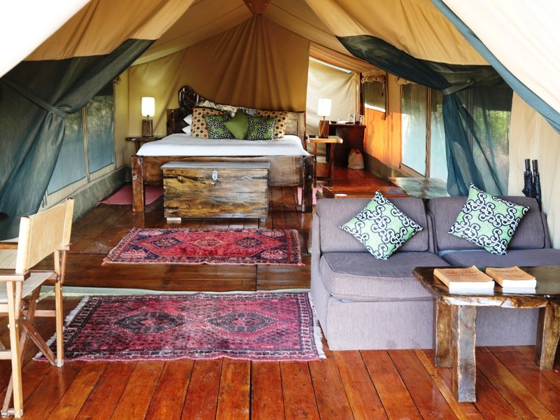 Das kleine Camp umfasst nur acht Zelte (davon ein Familienzelt für zwei Erwachsene und zwei Kinder), die alle als Dreibettzelte buchbar sind. Die Zelte entsprechen dem klassischen Hemmingway-Stil und sind sehr geräumig und komfortabel. Das Camp befindet sich nicht weit vom Seeufer entfernt. Vor allem in der Trockenzeit, wenn die Vegetation nicht so hoch steht, kann man von jedem Zelt aus auf den See blicken.