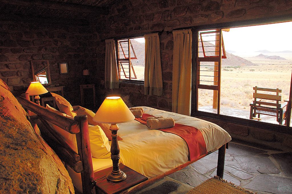 Die Eagle′s Nest Chalets befindet sich auf einem großzügigen Gelände etwa 2 km westlich von Aus in Richtung Lüderitz. Acht Chalets schmiegen sich an Granitfelsen und bieten einen fantastischen Blick auf die Wüste Namib. Jede Einheit verfügt über eine eigene Küche, einen Kamin und ein Wohnzimmer. Einziger Nachteil: Die Lodge ist ca. 7 km von der Rezeption und dem Restaurant (im Desert Horse Inn) entfernt. Man kann sich aber den Weg zum Frühstück sparen, indem man sich abends ein Breakfast-Package geben lässt.