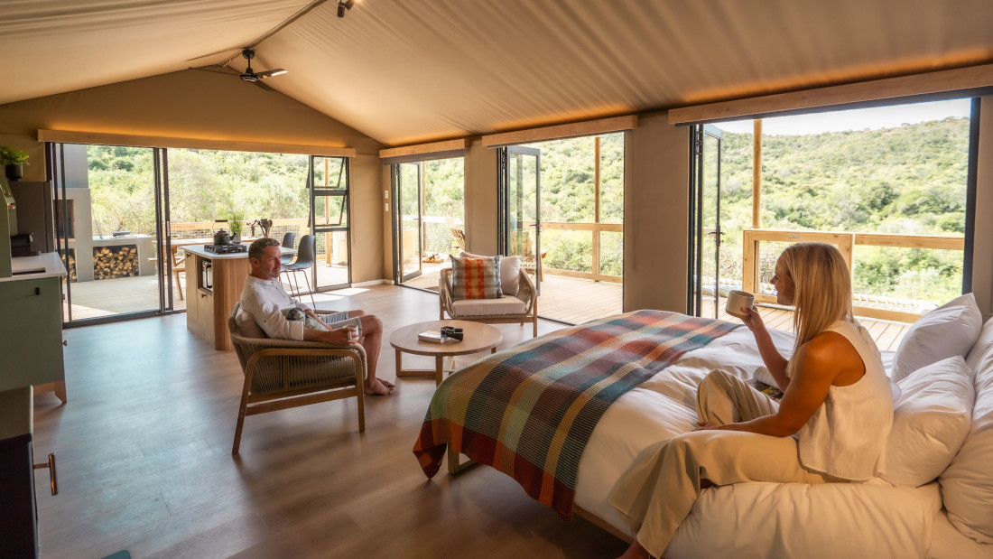 Sie setzen Ihre Reise entlang der Küste in östlicher Richtung fort bis in die Nähe des Addo Elephant National Parks. Die Landschaft wird zunehmend offener und geht in die charakteristischen Busch- und Farmregionen des Ostkaps über. Ihre Unterkunft liegt auf einer bewirtschafteten Zitrusfarm in den Ausläufern der Zuurberg-Berge, nur etwa 10 Kilometer vom Haupteingang des Addo Elephant National Parks entfernt. Die Lodge verbindet ländliche Ruhe mit der unmittelbaren Nähe zu einem der bedeutendsten Safari-Gebiete Südafrikas. Das Camp ist von dichter Buschvegetation umgeben und bietet weite Blicke über das Sundays River Valley. Die acht luxuriösen Glamping-Zelte sind so positioniert, dass sie maximale Privatsphäre und einen freien Blick in die Natur ermöglichen. Der Addo Elephant National Park ist bekannt für seine große Elefantenpopulation und bietet darüber hinaus die Chance, die „Big Seven“ zu erleben – darunter auch Löwen, Leoparden und Büffel sowie in den angrenzenden Meeresbereichen Wale und Weiße Haie. 2 Ü AfriCamps Addo (o.ä.), Glamping-Zelt mit Bad/WC, nur Übernachtung